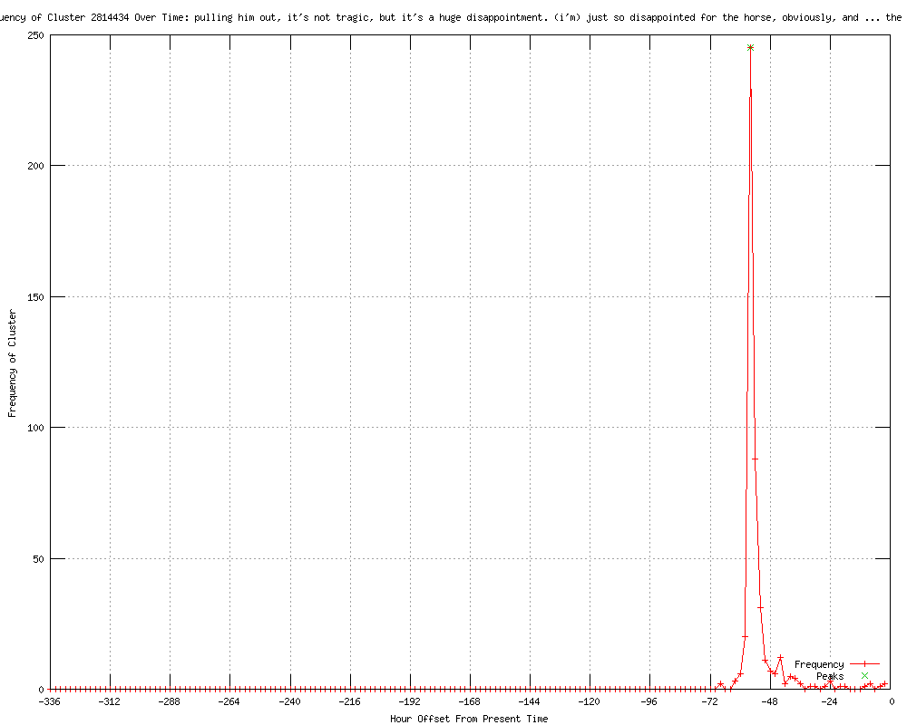 | 8 | pulling him out, it's not tragic, but it's a huge disappointment. (i'm) just so disappointed for the horse, obviously, and ... the whole team Urls http://cnn.com/2012/06/08/sport/ny-belmont-horse/index.html?eref=rss_topstories http://cnn.com/2012/06/08/sport/ny-belmont-horse/index.html?hpt=hp_t1 http://kpax.com/news/i-ll-have-another-scratched-from-belmont/ http://rss.cnn.com/~r/rss/cnn_topstories/~3/Kg0vgQY82I4/index.html http://ohnotheydidnt.livejournal.com/69578720.html http://dailyamerican.com/wpix-ill-have-another-scratched-from-belmont,0,4874296.story?track=rss http://wsbt.com/news/wpix-ill-have-another-scratched-from-belmont,0,187930.story http://wsbt.com/sports/wpix-ill-have-another-scratched-from-belmont,0,800771.story |