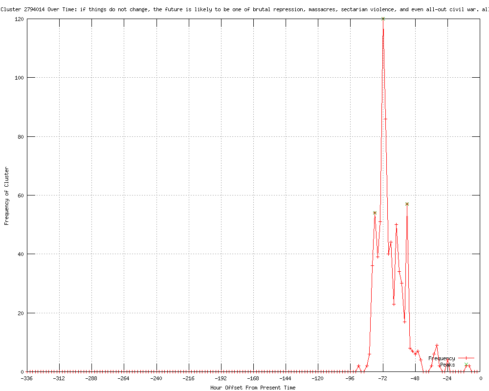 | 267 | if things do not change, the future is likely to be one of brutal repression, massacres, sectarian violence, and even all-out civil war Urls http://castanet.net/edition/news-story-76271-5-.htm#76271 http://castanet.net/edition/news-story-76274-5-.htm#76274 http://mysanantonio.com/news/article/UN-monitors-shot-at-trying-to-reach-massacre-site-3615497.php http://ajc.com/news/nation-world/un-monitors-shot-at-1453779.html?cxtype=rss_news_82109 http://mail.com/news/world/1342686-un-monitors-shot-trying-to-reach-massacre-site.html http://news.yahoo.com/un-monitors-shot-trying-reach-massacre-163433520.html http://newstimes.com/news/article/UN-monitors-shot-at-trying-to-reach-massacre-site-3615497.php http://seattlepi.com/news/article/UN-monitors-shot-at-trying-to-reach-massacre-site-3615497.php http://theglobeandmail.com/news/world/un-monitors-come-under-fire-while-heading-to-mass-killing-site/article4238107/?cmpid=rss1 http://newstalk650.com/content/un-monitors-shot-trying-reach-massacre-site http://ckom.com/content/un-monitors-shot-trying-reach-massacre-site http://cjme.com/content/un-monitors-shot-trying-reach-massacre-site http://mercurynews.com/nation-world/ci_20804895/u-n-monitors-syria-shot-at-while-trying?source=rss http://fortmilltimes.com/2012/06/07/2041748/un-monitors-shot-at-on-way-to.html http://seattlepi.com/news/article/UN-monitors-shot-at-on-way-to-Syrian-massacre-site-3615497.php http://news.yahoo.com/un-monitors-shot-way-syrian-massacre-184121602.html http://stuff.co.nz/world/middle-east/7057256/UN-monitors-shot-at-trying-to-reach-massacre-site http://newstalk650.com/content/un-monitors-shot-way-syrian-massacre-site http://ckom.com/content/un-monitors-shot-way-syrian-massacre-site http://dispatch.com/content/stories/national_world/2012/06/07/un-monitors-shot-at-on-way-to-massacre-site.html http://mail.com/news/world/1342686-un-monitors-shot-way-to-syrian-massacre-site.html http://enquirerherald.com/2012/06/07/1932535/un-monitors-shot-at-on-way-to.html http://cjme.com/content/un-monitors-shot-way-syrian-massacre-site http://mysanantonio.com/news/article/UN-monitors-shot-at-on-way-to-Syrian-massacre-site-3615497.php http://stuff.co.nz/timaru-herald/world/7057256/UN-monitors-shot-at-trying-to-reach-massacre-site http://globalnews.ca/Canada/un+chief+says+monitors+shot+at+trying+to+get+to+scene+of+latest+syrian+mass+killing/6442656519/story.html http://newstimes.com/news/article/UN-monitors-shot-at-on-way-to-Syrian-massacre-site-3615497.php http://bradenton.com/2012/06/07/4068715/un-monitors-shot-at-on-way-to.html#storylink=rss http://justthenews.info/latest-news/unarmed-un-monitors-shot-at-in-syria http://news.yahoo.com/un-monitors-shot-near-syrian-killings-200416189.html http://seattlepi.com/news/article/UN-monitors-shot-at-near-site-of-Syrian-killings-3615497.php http://newstimes.com/news/article/UN-monitors-shot-at-near-site-of-Syrian-killings-3615497.php http://newstalk650.com/content/un-monitors-shot-near-site-syrian-killings http://ckom.com/content/un-monitors-shot-near-site-syrian-killings http://cjme.com/content/un-monitors-shot-near-site-syrian-killings http://mysanantonio.com/news/article/UN-monitors-shot-at-near-site-of-Syrian-killings-3615497.php http://guardian.co.uk/world/feedarticle/10278319 http://dailycaller.com/2012/06/07/uk-pm-urges-concerted-action-on-syria/ http://newstalk650.com/content/un-monitors-shot-near-site-syrian-killings-0 http://dailytribune.com/article/20120607/NEWS05/120609644/u-n-monitors-shot-at-near-site-of-syrian-killings http://spokesman.com/stories/2012/jun/07/un-observers-attacked-in-syria/ http://svherald.com/associatedpress/268533 http://macombdaily.com/article/20120607/NEWS05/120609594/u-n-monitors-shot-at-near-site-of-syrian-killings http://news-sentinel.com/apps/pbcs.dll/article?AID=/20120607/NEWS/120609673 http://news-sentinel.com/apps/pbcs.dll/article?AID=/20120607/NEWS/120609673/1006 http://wvgazette.com/rssFeeds/201206070128 http://denverpost.com/nationworld/ci_20802238/activists-dozens-dead-new-syria-massacre?source=rss http://denverpost.com/breakingnews/ci_20802238/activists-dozens-dead-new-syria-massacre?source=rss http://komonews.com/news/local/UN-monitors-shot-at-near-site-of-Syrian-killings--157950135.html http://krgv.com/news/un-monitors-shot-at-near-site-of-syrian-killings http://guardian.co.uk/world/feedarticle/10278505 http://kcby.com/news/national/UN-monitors-shot-at-near-site-of-Syrian-killings--157950135.html http://komonews.com/news/national/UN-monitors-shot-at-near-site-of-Syrian-killings--157950135.html http://nola.com/politics/index.ssf/2012/06/un_monitors_in_syria_are_shot.html http://newstalkradiowhio.com/ap/ap/social-issues/uk-pm-urges-concerted-action-on-syria/nPNdT/ http://guardian.co.uk/world/feedarticle/10278620 http://townhall.com/news/world/2012/06/07/syrian_president_appoints_new_prime_minister http://.wsls.com/news/2012/jun/07/un-monitors-shot-at-near-site-of-syrian-killings-ar-1974145/ http://news-sentinel.com/apps/pbcs.dll/article?AID=/20120607/NEWS/120609673/1006/YOURVOICE_LOCAL http://wsbradio.com/ap/ap/social-issues/uk-pm-urges-concerted-action-on-syria/nPNdT/ http://csmonitor.com/World/Latest-News-Wires/2012/0607/Syria-UN-observers-come-under-attack http://kdwn.com/news/world-news/UN_monitors_shot_at_near_site_of_Syrian_killings http://guardian.co.uk/world/feedarticle/10278825 http://independent.ie/world-news/middle-east/syria-un-observers-come-under-fire-trying-to-reach-site-of-latest-massacre-3132495.html http://findata.co.nz/News/15876814/UN_monitors_fired_on_in_Syria.htm http://news-gazette.com/news/politics-and-government/2012-06-07/un-monitors-shot-near-site-syrian-killings.html http://newsday.com/news/world/un-monitors-under-fire-near-site-of-syrian-killings-1.3768256 http://thejakartapost.com/news/2012/06/08/un-monitors-shot-near-site-syrian-killings.html http://newsday.com/news/world/un-monitors-shot-at-near-site-of-syrian-killings--1.3768953 http://telegraph.feedsportal.com/c/32726