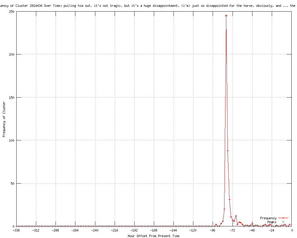 | 8 | pulling him out, it's not tragic, but it's a huge disappointment. (i'm) just so disappointed for the horse, obviously, and ... the whole team Urls http://cnn.com/2012/06/08/sport/ny-belmont-horse/index.html?eref=rss_topstories http://cnn.com/2012/06/08/sport/ny-belmont-horse/index.html?hpt=hp_t1 http://kpax.com/news/i-ll-have-another-scratched-from-belmont/ http://rss.cnn.com/~r/rss/cnn_topstories/~3/Kg0vgQY82I4/index.html http://ohnotheydidnt.livejournal.com/69578720.html http://dailyamerican.com/wpix-ill-have-another-scratched-from-belmont,0,4874296.story?track=rss http://wsbt.com/news/wpix-ill-have-another-scratched-from-belmont,0,187930.story http://wsbt.com/sports/wpix-ill-have-another-scratched-from-belmont,0,800771.story |