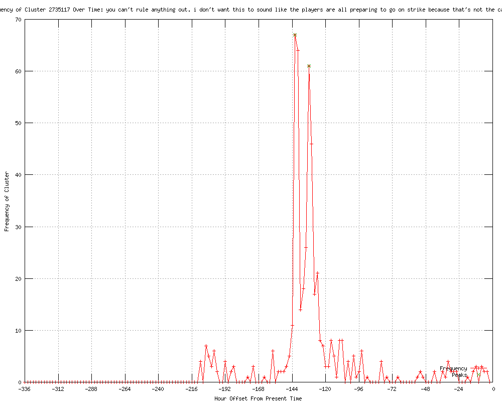 | 17 | you can't rule anything out. i don't want this to sound like the players are all preparing to go on strike because that's not the case at all Urls http://news.smh.com.au/breaking-news-sport/cricket-strike-would-be-last-resort-marsh-20120604-1zs5y.html http://news.theage.com.au/breaking-news-sport/cricket-strike-would-be-last-resort-marsh-20120604-1zs5y.html http://news.brisbanetimes.com.au/breaking-news-sport/cricket-strike-would-be-last-resort-marsh-20120604-1zs5y.html http://au.sports.yahoo.com/cricket/news/article/-/13866204/cricket-strike-would-be-last-resort-marsh/ http://au.sports.yahoo.com/news/article/-/13866204/cricket-strike-would-be-last-resort-marsh/ http://au.sports.yahoo.com/cricket/news/article/-/13866508/cricket-australian-players-fail-to-rule-out-strike-action/ http://abc.net.au/news/2012-06-04/aussie-cricketers-wont-rule-out-pay-strike/4051972 http://timesofindia.feedsportal.com/fy/8at2Etc0aKcwU2V2/story01.htm http://au.sports.yahoo.com/news/article/-/13866508/cricket-australian-players-fail-to-rule-out-strike-action/ http://cricbuzz.com/cricket-news/51419/Players-to-go-on-strike-as-a- http://theroar.com.au/2012/06/05/cricket-strike-last-resort-says-paul-marsh/ http://cricbuzz.com/cricket-news/51423/Australia-cricketers-fail-to-rule-out-strike-action http://centralchronicle.com/australian-players-fail-to-rule-out-strike-action.html http://espnstar.com/home/news/detail/item811062 http://andhranews.net/Sports/2012/ACA-chief-Marsh-players-strike-absolute-5274.htm http://truthdive.com/2012/06/05/ACA-chief-Marsh-says-players-strike-would-be-absolute-last-resort.html http://indiatalkies.com/2012/06/aca-chief-marsh-players-strike-absolute-resort.html |