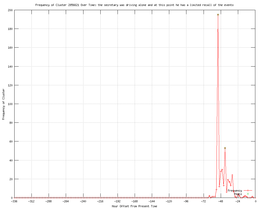 | 19 | the secretary was driving alone and at this point he has a limited recall of the events Urls http://thedailybeast.com/articles/2012/06/11/missing-clues-in-commerce-secretary-s-hit-and-run.html http://us.rd.yahoo.com/finance/external/reuters/rss/SIG=12iebv4hu/*http://www.reuters.com/article/2012/06/11/usa-bryson-crash-idUSL1E8HB15220120611?feedType=RSS&feedName=financialsSector&rpc=43 http://us.rd.yahoo.com/finance/external/reuters/rss/SIG=12ieealko/*http://www.reuters.com/article/2012/06/12/usa-bryson-crash-idUSL1E8HB15220120612?feedType=RSS&feedName=financialsSector&rpc=43 http://reuters.com/article/2012/06/12/us-usa-bryson-crash-statement-idUSBRE85A0T920120612?feedType=RSS&feedName=topNews http://uk.reuters.com/article/2012/06/12/usa-bryson-crash-idUKL1E8HB15220120612?feedType=RSS&feedName=rbssFinancialServicesAndRealEstateNews http://news.yahoo.com/commerce-secretary-probed-car-crashes-seizure-cited-005924149--finance.html http://feeds.reuters.com/~r/Reuters/domesticNews/~3/7l7xhZErg-s/us-usa-bryson-crash-statement-idUSBRE85A0T920120612 http://reuters.com/article/2012/06/12/us-usa-bryson-crash-statement-idUSBRE85A0T920120612?feedType=RSS&feedName=domesticNews http://reuters.com/article/2012/06/12/us-usa-bryson-crash-statement-idUSBRE85A0T920120612 http://feeds.reuters.com/~r/reuters/topNews/~3/okqdORBKBi0/us-usa-bryson-crash-statement-idUSBRE85A0T920120612 http://en-maktoob.news.yahoo.com/u-commerce-secretary-suffered-seizure-spokeswoman-135618999.html http://uk.news.yahoo.com/commerce-secretary-probed-car-crashes-seizure-cited-005924149--finance.html http://baltimoresun.com/news/sns-rt-us-usa-bryson-crashbre85a0k2-20120611,0,5396913.story?track=rss http://ky3.com/news/sns-rt-us-usa-bryson-crashbre85a0k2-20120611,0,6236183.story http://publicbroadcasting.net/wabe/news.newsmain/article/0/0/1936849/US/Commerce.Secretary.Bryson.to.take.medical.leave http://publicbroadcasting.net/wuky/news.newsmain/article/0/0/1936849/US/Commerce.Secretary.Bryson.to.take.medical.leave http://publicbroadcasting.net/wkyu/news.newsmain/article/0/0/1936849/US/Commerce.Secretary.Bryson.to.take.medical.leave http://publicbroadcasting.net/wkyu/news.newsmain/article/0/0/1936850/Top.Stories/Commerce.Secretary.Bryson.to.take.medical.leave http://ibtimes.com/articles/350972/20120611/john-bryson-commerce-secretary.htm |