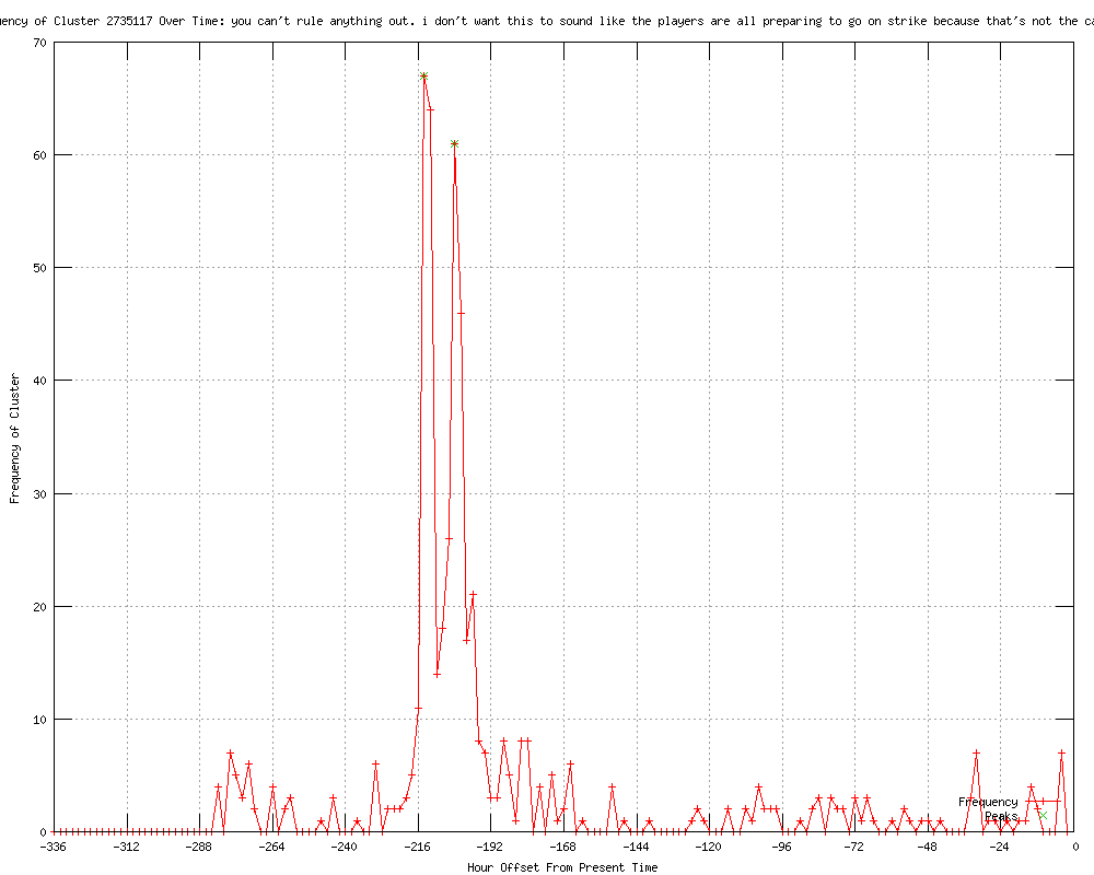 | 17 | you can't rule anything out. i don't want this to sound like the players are all preparing to go on strike because that's not the case at all Urls http://news.smh.com.au/breaking-news-sport/cricket-strike-would-be-last-resort-marsh-20120604-1zs5y.html http://news.theage.com.au/breaking-news-sport/cricket-strike-would-be-last-resort-marsh-20120604-1zs5y.html http://news.brisbanetimes.com.au/breaking-news-sport/cricket-strike-would-be-last-resort-marsh-20120604-1zs5y.html http://au.sports.yahoo.com/cricket/news/article/-/13866204/cricket-strike-would-be-last-resort-marsh/ http://au.sports.yahoo.com/news/article/-/13866204/cricket-strike-would-be-last-resort-marsh/ http://au.sports.yahoo.com/cricket/news/article/-/13866508/cricket-australian-players-fail-to-rule-out-strike-action/ http://abc.net.au/news/2012-06-04/aussie-cricketers-wont-rule-out-pay-strike/4051972 http://timesofindia.feedsportal.com/fy/8at2Etc0aKcwU2V2/story01.htm http://au.sports.yahoo.com/news/article/-/13866508/cricket-australian-players-fail-to-rule-out-strike-action/ http://cricbuzz.com/cricket-news/51419/Players-to-go-on-strike-as-a- http://theroar.com.au/2012/06/05/cricket-strike-last-resort-says-paul-marsh/ http://cricbuzz.com/cricket-news/51423/Australia-cricketers-fail-to-rule-out-strike-action http://centralchronicle.com/australian-players-fail-to-rule-out-strike-action.html http://espnstar.com/home/news/detail/item811062 http://andhranews.net/Sports/2012/ACA-chief-Marsh-players-strike-absolute-5274.htm http://truthdive.com/2012/06/05/ACA-chief-Marsh-says-players-strike-would-be-absolute-last-resort.html http://indiatalkies.com/2012/06/aca-chief-marsh-players-strike-absolute-resort.html |