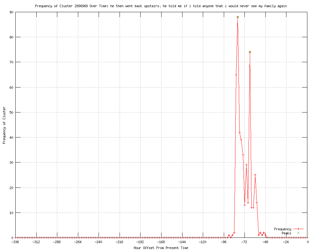 | 6 | he told me if i ever told anyone, i'd never see my family again Urls http://huffingtonpost.com/2012/06/13/jerry-sandusky-trial-testimony-penn-state_n_1594915.html http://examiner.com/article/victim-10-if-i-ever-told-anyone-i-d-never-see-my-family-again http://sportmax.se/2012/06/13/alleged-victim-10-says-sandusky-forced-him-to-have-oral-sex/ http://sportmax.se/2012/06/13/alleged-victim-10-says-sandusky-forced-him-to-have-oral-sex-2/ http://entertainment.wagerweb.com/wtf/victim-10-takes-stand-in-jerry-sandusky-trial-43383.html http://sportmax.se/2012/06/14/sandusky-accuser-i-felt-his-body-on-my-back/ |