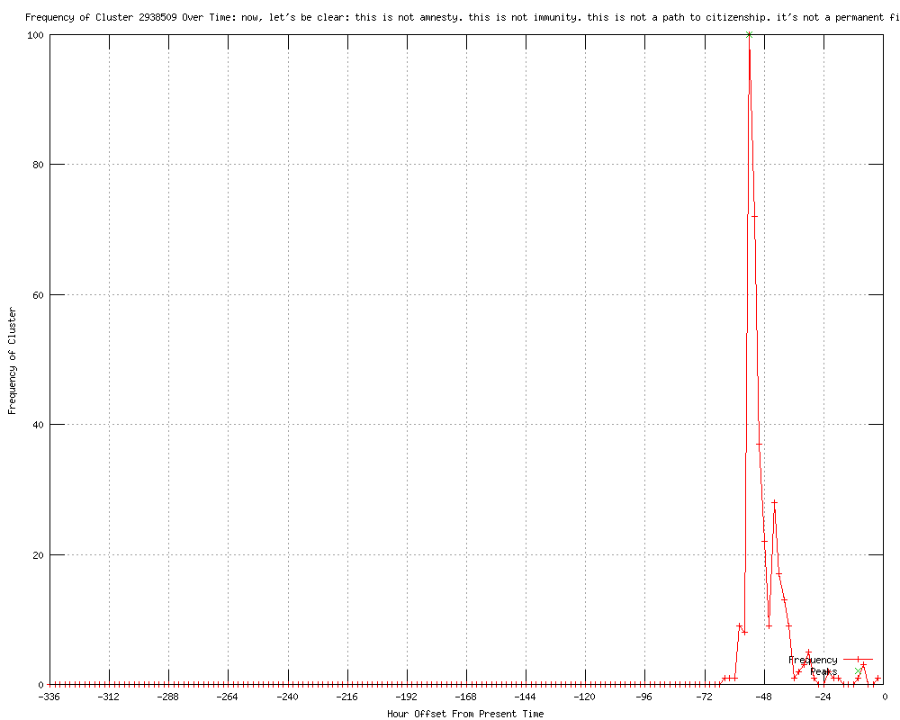 | 6 | this is not amnesty. this is not immunity. this is not a path to citizenship Urls http://latimes.com/news/politics/la-pn-obama-immigration-announcement-20120615,0,7841402.story?track=rss http://latimes.com/news/politics/la-pn-obama-immigration-announcement-20120615,0,7841402.story http://commercialappeal.com/news/2012/jun/16/obama-loosens-immigration-rules/?partner=RSS http://commercialappeal.com/news/2012/jun/16/obama-loosens-immigration-rules/?partner=yahoo_feeds http://reason.com/blog/2012/06/15/this-is-not-amnesty-this-is-not-immunity http://reason.com/blog/2012/06/15/this-is-not-amnesty-this-is-not-immunity?utm_source=feedburner&utm_medium=feed&utm_campaign=Feed%3A+reason%2FHitandRun+%28Reason+Online+-+Hit+%26+Run+Blog%29 |