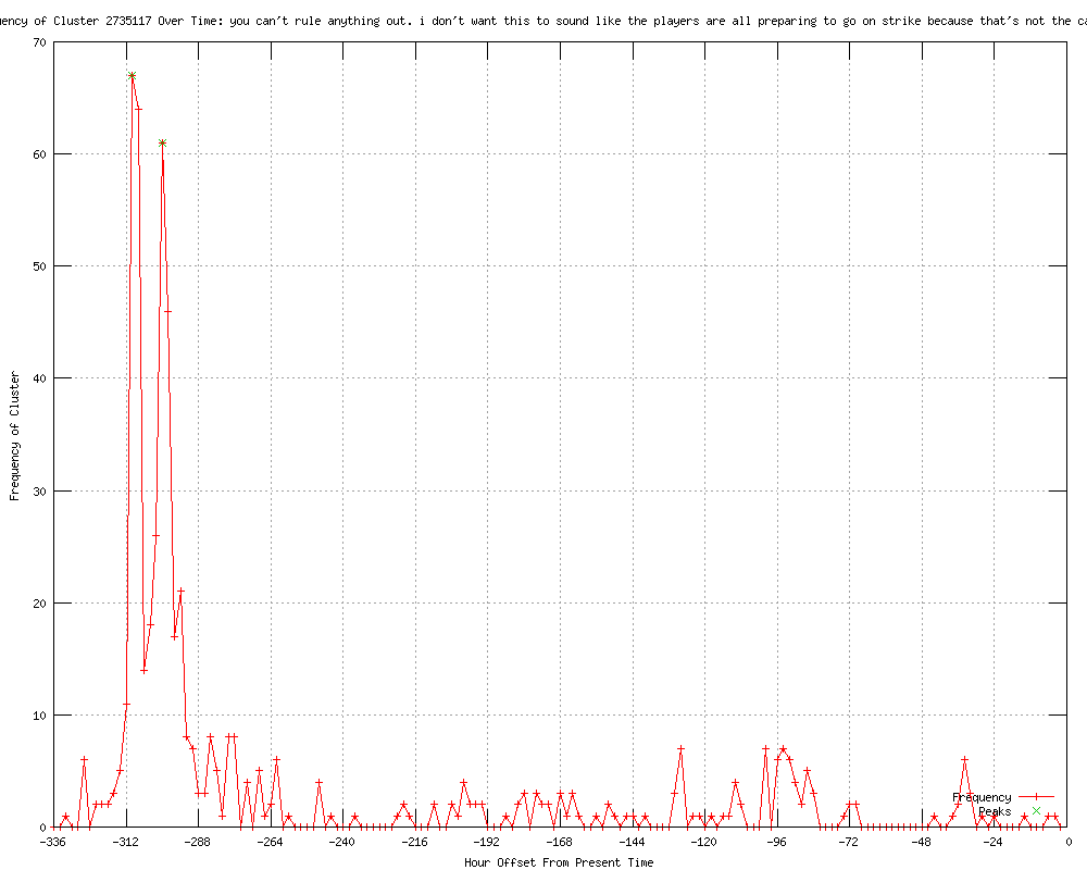 | 17 | you can't rule anything out. i don't want this to sound like the players are all preparing to go on strike because that's not the case at all Urls http://news.smh.com.au/breaking-news-sport/cricket-strike-would-be-last-resort-marsh-20120604-1zs5y.html http://news.theage.com.au/breaking-news-sport/cricket-strike-would-be-last-resort-marsh-20120604-1zs5y.html http://news.brisbanetimes.com.au/breaking-news-sport/cricket-strike-would-be-last-resort-marsh-20120604-1zs5y.html http://au.sports.yahoo.com/cricket/news/article/-/13866204/cricket-strike-would-be-last-resort-marsh/ http://au.sports.yahoo.com/news/article/-/13866204/cricket-strike-would-be-last-resort-marsh/ http://au.sports.yahoo.com/cricket/news/article/-/13866508/cricket-australian-players-fail-to-rule-out-strike-action/ http://abc.net.au/news/2012-06-04/aussie-cricketers-wont-rule-out-pay-strike/4051972 http://timesofindia.feedsportal.com/fy/8at2Etc0aKcwU2V2/story01.htm http://au.sports.yahoo.com/news/article/-/13866508/cricket-australian-players-fail-to-rule-out-strike-action/ http://cricbuzz.com/cricket-news/51419/Players-to-go-on-strike-as-a- http://theroar.com.au/2012/06/05/cricket-strike-last-resort-says-paul-marsh/ http://cricbuzz.com/cricket-news/51423/Australia-cricketers-fail-to-rule-out-strike-action http://centralchronicle.com/australian-players-fail-to-rule-out-strike-action.html http://espnstar.com/home/news/detail/item811062 http://andhranews.net/Sports/2012/ACA-chief-Marsh-players-strike-absolute-5274.htm http://truthdive.com/2012/06/05/ACA-chief-Marsh-says-players-strike-would-be-absolute-last-resort.html http://indiatalkies.com/2012/06/aca-chief-marsh-players-strike-absolute-resort.html |