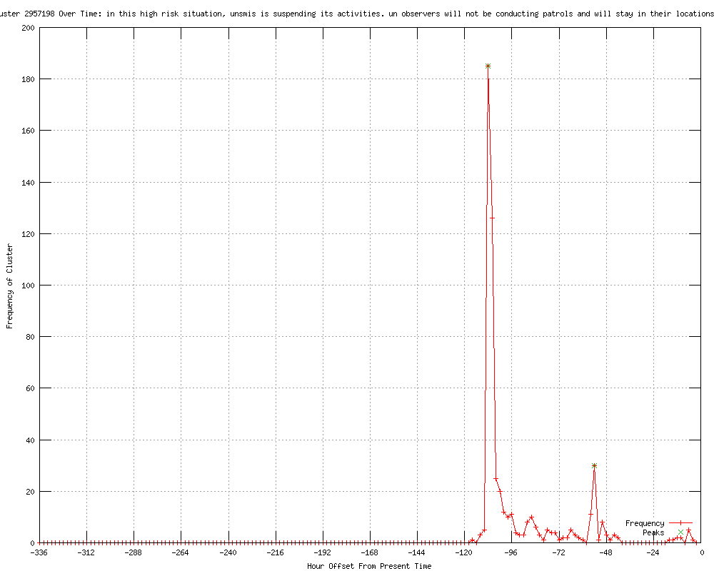 | 14 | in this high risk situation, unsmis is suspending its activities. un observers will not be conducting patrols and will stay in their locations until further notice Urls http://in.reuters.com/article/2012/06/16/syria-crisis-monitors-idINDEE85F04K20120616?feedType=RSS&feedName=topNews http://thestar.com.my.feedsportal.com/c/33048/f/534559/s/206a49ed/l/0Lthestar0N0Bmy0Cnews0Cstory0Basp0Dfile0F0C20A120C60C160Cworldupdates0C20A120E0A60E16T13570A7Z0I1120IBRE84S0AP30IRTROPTT0I0A0IUK0ESYRIA0ECRISIS0Gsec0FWorldupdates/story01.htm http://news.yahoo.com/u-n-suspends-syria-monitoring-violence-rages-135943219.html http://.canada.com/nanaimodailynews/news/story.html?id=6793898 http://publicbroadcasting.net/wabe/news.newsmain/article/0/0/1938330/World/U.N..suspends.Syria.monitoring.as.violence.rages http://publicbroadcasting.net/wkyu/news.newsmain/article/0/0/1938332/Top.Stories/U.N..suspends.Syria.monitoring.as.violence.rages http://publicbroadcasting.net/wkyu/news.newsmain/article/0/0/1938330/World/U.N..suspends.Syria.monitoring.as.violence.rages http://publicbroadcasting.net/wuky/news.newsmain/article/0/0/1938330/World/U.N..suspends.Syria.monitoring.as.violence.rages http://timesofindia.feedsportal.com/fy/8at2EtZ0ao4lG2Zk/story01.htm http://timesofindia.feedsportal.com/fy/8at2Eur0ao4fI2Zj/story01.htm http://thestar.com.my.feedsportal.com/c/33048/f/534559/s/206aea8c/l/0Lthestar0N0Bmy0Cnews0Cstory0Basp0Dfile0F0C20A120C60C160Cworldupdates0C20A120E0A60E16T150A80A6Z0I1140IBRE84S0AP30IRTROPTT0I0A0IUK0ESYRIA0ECRISIS0Gsec0FWorldupdates/story01.htm http://trust.org/alertnet/news/un-suspends-syria-monitoring-as-violence-rages http://jpost.com/MiddleEast/Article.aspx?id=274055&R=R3 http://dailytimes.com.pk/default.asp?page=2012%5c06%5c17%5cstory_17-6-2012_pg7_8 |