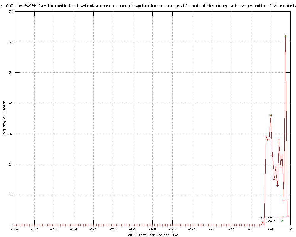 | 17 | while the department assesses mr. assange's application, mr. assange will remain at the embassy, under the protection of the ecuadorian government Urls http://examiner.com/article/julian-assange-seeks-asylum-ecuador-s-london-embassy http://tech-ex.net/2012/06/julian-assange-asks-londons-ecuadorian.html http://thezimbabwemail.com/world/12262-ecuador-says-wikileaks-assange-seeks-asylum.html http://stabroeknews.com/2012/news/breaking-news/06/19/ecuador-says-wikileaks-assange-seeks-asylum/ http://freeinternetpress.com/story/WikiLeaks-Update-Julian-Assange-Seeks-Asylum-In-Ecuadorian-Embassy-In-London-35166.html http://indexonline.org/assange-seeks-political-asylum-in-ecuador-3/167204?utm_source=rss&utm_medium=rss&utm_campaign=assange-seeks-political-asylum-in-ecuador-3 http://indexonline.org/assange-seeks-political-asylum-in-ecuador-2/167201?utm_source=rss&utm_medium=rss&utm_campaign=assange-seeks-political-asylum-in-ecuador-2 http://upi.com/Top_News/World-News/2012/06/19/Assange-seeks-political-asylum-in-Ecuador/UPI-57561340148899/ http://istockanalyst.com/article/viewarticle/articleid/5906222 http://redorbit.com/news/technology/1112641917/wikileaks-assange-seeks-asylum-at-ecuadors-london-embassy/ http://warisacrime.org/content/julian-assange-gets-out-dodge http://consortiumnews.com/2012/06/20/julian-assanges-artful-dodge/ http://opednews.com/articles/Julian-Assange-s-Artful-Do-by-Ray-McGovern-120620-60.html http://original.antiwar.com/mcgovern/2012/06/20/julian-assanges-artful-dodge/ http://theprogressivemind.info/?p=88022 http://examiner.com/article/julian-assange-seeks-asylum-ecuador-s-london-embassy?cid=PROG-ExaminerArticle-HomepageHotTopic3-AssangeAsylum http://postchronicle.com/news/breakingnews/article_212411782.shtml |