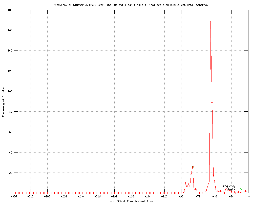 | 47 | we still can't make a final decision public yet until tomorrow Urls http://independent.ie/world-news/europe/wikileaks-julian-assange-decision-expected-today-on-asylum-bid-to-ecuador-3145733.html http://rte.ie/news/2012/0621/julian-assange-ecuador.html http://guardian.co.uk/media/2012/jun/21/julian-assange-ecuador-decision-asylum http://standard.co.uk/news/uk/ecuadorian-ambassador-says-country-is-considering-wikileaks-founder-julian-assanges-bid-for-political-asylum-7872213.html http://standard.co.uk/news/uk/wikileaks-julian-assanges-bid-for-political-asylum-at-ecuadorian-embassy-to-be-decided-today-7872213.html http://feeds.guardian.co.uk/%7Er/theguardian/media/rss/%7E3/DOusjqfHbec/julian-assange-ecuador-decision-asylum http://uk.news.yahoo.com/ecuador-decision-assange-asylum-imminent-report-065437980.html http://news.yahoo.com/ecuador-decision-assange-asylum-imminent-report-065437980.html http://news.yahoo.com/ecuador-decision-assange-asylum-imminent-report-072023028.html http://worldbulletin.net/index.php?aType=haber&ArticleID=91582 http://japantoday.com/category/world/view/ecuador-decision-on-assange-asylum-imminent-report http://archive.japantoday.com/category/world/view/ecuador-decision-on-assange-asylum-imminent-report http://rssreader.blogspot.com/2012/06/y-alert-yahoo-news-latest-news_8926.html http://rssreader.blogspot.com/2012/06/y-alert-yahoo-news-latest-news_9710.html http://thextrivia.blogspot.com/2012/06/oracle-chief-buys-hawaiian-island.html http://dnaindia.com/world/report_ecuador-decision-on-assange-asylum-imminent_1704931 http://edition.cnn.com/2012/06/21/world/europe/uk-assange-asylum/index.html http://paginadeinicio.com.mx/blog/679804/report-ecuador-decision-on-assange-asylum-imminent/ http://news24.com/World/News/Ecuador-decision-on-Assange-imminent-20120621 http://telegraph.feedsportal.com/c/32726/f/534871/s/2093c9a2/l/0L0Stelegraph0O0Cnews0Cworldnews0Cwikileaks0C93468650CJulian0EAssange0Ewill0Ebe0Earrested0Eregardless0Eof0EEcuador0Easylum0Edecision0Bhtml/story01.htm http://moblog.whmsoft.net/en/?p=4180 http://edition.cnn.com/2012/06/21/world/europe/uk-assange-asylum/index.html?eref=edition http://rssreader.blogspot.com/2012/06/y-alert-yahoo-news-latest-news_8775.html http://telegraph.feedsportal.com/c/32726/f/579330/s/2094097c/l/0L0Stelegraph0O0Cnews0Cworldnews0Cwikileaks0C93468650CJulian0EAssange0Ewill0Ebe0Earrested0Eregardless0Eof0EEcuador0Easylum0Edecision0Bhtml/story01.htm http://rssreader.blogspot.com/2012/06/y-alert-yahoo-news-latest-news_2786.html http://torontosun.com/2012/06/21/assange-ready-for-arrest http://calgarysun.com/2012/06/21/assange-ready-for-arrest http://winnipegsun.com/2012/06/21/assange-ready-for-arrest http://ottawasun.com/2012/06/21/assange-ready-for-arrest http://edmontonsun.com/2012/06/21/assange-ready-for-arrest http://odt.co.nz/news/world/214206/assange-ready-arrest-if-asylum-bid-fails http://feeds.huffingtonpost.com/~r/HP/media/~3/dsTXkgQkS0U/julian-assange-arrest-asylum_n_1616207.html http://Theatlantic.feedsportal.com/c/34375/f/625848/s/209e2a12/l/0L0Stheatlanticwire0N0Cglobal0C20A120C0A60Cecuador0Egetting0Ecold0Efeet0Ejulian0Eassanges0Easylum0C538280C/story01.htm http://reuters.com/article/2012/06/22/us-britain-ecuador-assange-idUSBRE85L13H20120622?feedType=RSS&feedName=topNews http://wkzo.com/news/articles/2012/jun/22/assange-ready-for-arrest-if-denied-asylum-colleague/ http://publicbroadcasting.net/wuky/news.newsmain/article/0/0/1940142/World/Assange.ready.for.arrest.if.denied.asylum.colleague http://news.yahoo.com/wikileaks-assange-says-ready-life-ecuador-010422970.html http://reuters.com/article/2012/06/22/us-britain-ecuador-assange-idUSBRE85L13H20120622?feedType=RSS&feedName=worldNews http://feeds.reuters.com/~r/reuters/topNews/~3/Y5Jjc0KNPJc/us-britain-ecuador-assange-idUSBRE85L13H20120622 http://newsdaily.com/stories/bre85l13h-us-britain-ecuador-assange/ http://feeds.reuters.com/~r/Reuters/worldNews/~3/emoPV9QbUIc/us-britain-ecuador-assange-idUSBRE85L13H20120622 http://publicbroadcasting.net/wabe/news.newsmain/article/0/0/1940142/World/Assange.ready.for.arrest.if.denied.asylum.colleague http://publicbroadcasting.net/wkyu/news.newsmain/article/0/0/1940142/World/Assange.ready.for.arrest.if.denied.asylum.colleague http://publicbroadcasting.net/wkyu/news.newsmain/article/0/0/1940146/Top.Stories/Assange.ready.for.arrest.if.denied.asylum.colleague http://rocketnews.com/2012/06/assange-ready-for-arrest-if-denied-asylum-colleague/ http://kgmi.com/Assange-ready-for-arrest-if-denied-asylum-colleagu/11461924?newsId=150183 http://reuters.com/article/2012/06/22/us-britain-ecuador-assange-idUSBRE85L13H20120622 |