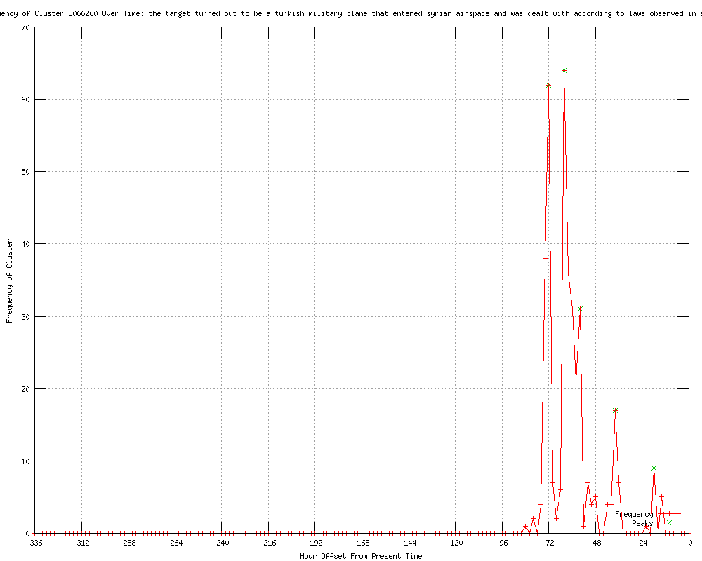 | 354 | the target turned out to be a turkish military plane that entered syrian airspace and was dealt with according to laws observed in such cases Urls http://wlbt.com/story/18853841/syrian-activists-report-more-defections http://kcbd.com/story/18853841/syrian-activists-report-more-defections http://wlox.com/story/18853841/syrian-activists-report-more-defections http://wxvt.com/Global/story.asp?S=18853841 http://wthr.com/story/18853841/syrian-activists-report-more-defections http://kwqc.com/story/18853841/syrian-activists-report-more-defections http://wdam.com/story/18853841/syrian-activists-report-more-defections http://nbc12.com/story/18853841/syrian-activists-report-more-defections http://waff.com/story/18853841/syrian-activists-report-more-defections http://wbtv.com/story/18853841/syrian-activists-report-more-defections http://ksla.com/story/18853841/syrian-activists-report-more-defections http://whbf.com/story/18853841/syrian-activists-report-more-defections http://kwwl.com/story/18853841/syrian-activists-report-more-defections http://wistv.com/story/18853841/syrian-activists-report-more-defections http://wrex.com/story/18853841/syrian-activists-report-more-defections http://guardian.co.uk/world/feedarticle/10302825 http://cbs8.com/story/18860369/syrian-government-accuses-rebels-of-mass-killing http://gazettenet.com/2012/06/23/syrian-government-accuses-rebels-of-mass-killing http://ckom.com/content/syrian-government-accuses-rebels-mass-killing http://cjme.com/content/syrian-government-accuses-rebels-mass-killing http://hutchnews.com/Todaystop/syria-update-COPY http://newstalk650.com/content/syrian-government-accuses-rebels-mass-killing http://thejakartapost.com/news/2012/06/23/syrian-government-accuses-rebels-mass-killing.html http://seattlepi.com/news/article/Syria-says-it-shot-down-Turkish-air-force-3655034.php http://wistv.com/story/18855447/turkey-says-warplane-goes-missing-near-syria http://kfvs.com/story/18855447/turkey-says-warplane-goes-missing-near-syria http://wrex.com/story/18855447/turkey-says-warplane-goes-missing-near-syria http://mail.com/news/world/1380880-syria-shot-turkish-air-force.html http://koamtv.com/story/18855447/turkey-says-warplane-goes-missing-near-syria http://myfoxdfw.com/story/18855447/turkey-says-warplane-goes-missing-near-syria http://kxxv.com/story/18855447/turkey-says-warplane-goes-missing-near-syria http://news.yahoo.com/syria-says-shot-down-turkish-air-force-231348275.html http://ajc.com/news/nation-world/syria-says-it-shot-1462604.html?cxtype=rss_news_82109 http://newson6.com/story/18855447/turkey-says-warplane-goes-missing-near-syria http://ckom.com/content/syria-says-it-shot-down-turkish-air-force http://cbsnews.com/8301-202_162-57459134/syria-says-it-shot-down-turkish-air-force-jet/ http://feeds.cbsnews.com/~r/CBSNewsMain/~3/ouQ_bFSMhGM/ http://sfgate.com/cgi-bin/article.cgi?f=/n/a/2012/06/22/international/i161617D75.DTL&feed=rss.news_world http://cjme.com/content/syria-says-it-shot-down-turkish-air-force http://whbf.com/story/18855447/turkey-says-warplane-goes-missing-near-syria http://globalsaskatoon.com/world/report+syria+turkey+search+for+missing+turkish+warplane+in+eastern+mediterranean/6442666550/story.html http://utsandiego.com/news/2012/jun/22/syria-says-it-shot-down-turkish-air-force/ http://kdwn.com/news/world-news/Syria_says_it_shot_down_Turkish_air_force http://ichuddersfield.icnetwork.co.uk/examiner/news/breakingnews/tm_headline=syria-shot-down-turkish-war-plane%26method=full%26objectid=31244187%26siteid=50060-name_page.html http://walesonline.co.uk/news/uk-news/2012/06/23/syria-shot-down-turkish-war-plane-91466-31244145/ http://news.theage.com.au/breaking-news-world/syria-says-it-shot-down-turkish-plane-20120623-20udv.html http://chroniclelive.co.uk/north-east-news/uk-and-world-news/2012/06/23/syria-shot-down-turkish-war-plane-84229-31244154/ http://chesterchronicle.co.uk/chester-news/uk-world-news/2012/06/23/syria-shot-down-turkish-war-plane-59067-31244174/ http://birminghammail.net/news/national-news/2012/06/23/syria-shot-down-turkish-war-plane-97319-31244138/ http://harrowobserver.co.uk/west-london-news/world-uk-news/2012/06/23/syria-shot-down-turkish-war-plane-116451-31244123/ http://standard.co.uk/panewsfeeds/syria-shot-down-turkish-war-plane-7876604.html http://liverpooldailypost.co.uk/liverpool-news/uk-world-news/2012/06/23/syria-shot-down-turkish-war-plane-99623-31244137/ http://liverpoolecho.co.uk/liverpool-news/uk-world-news/2012/06/23/syria-shot-down-turkish-war-plane-100252-31244136/ http://da.feedsportal.com/c/845/f/464365/s/20a0cc60/l/0L0Sbelfasttelegraph0O0Cnews0Cworld0Enews0Csyria0Eshot0Edown0Eturkish0Ewar0Eplane0E161760A40A0Bhtml0Dr0FRSS/ia1.htm http://buckinghamshireadvertiser.co.uk/south-buckinghamshire-news/doctorsstrike/2012/06/23/syria-shot-down-turkish-war-plane-113046-31244126/ http://buckinghamshireadvertiser.co.uk/south-buckinghamshire-news/world-uk-news/2012/06/23/syria-shot-down-turkish-war-plane-82398-31244156/ http://au.news.yahoo.com/a/-/business/14019859/syria-says-it-shot-down-turkish-plane/ http://news.smh.com.au/breaking-news-world/syria-says-it-shot-down-turkish-plane-20120623-20udv.html http://au.news.yahoo.com/a/-/world/14019859/syria-says-it-shot-down-turkish-plane/ http://sundaysun.co.uk/news/uk-world-news/2012/06/23/syria-shot-down-turkish-war-plane-84229-31244154/ http://dailypost.co.uk/news/breaking-news/2012/06/23/syria-shot-down-turkish-war-plane-55578-31244176/ http://wirralnews.co.uk/wirral-news/wirral-breaking-news/2012/06/23/syria-shot-down-turkish-war-plane-80491-31244160/ http://buckinghamshireexaminer.co.uk/south-bucks-news/world-uk-news/2012/06/23/syria-shot-down-turkish-war-plane-114018-31244124/ http://uk.express.feedsportal.com/c/33338/f/565860/s/20a0e69b/l/0L0Sdailyexpress0O0Cposts0Cview0C328280A0CSyria0Eshot0Edown0ETurkish0Ewar0Eplane0E0C/story01.htm http://uxbridgegazette.co.uk/west-london-news/world-uk-news/2012/06/23/syria-shot-down-turkish-war-plane-113046-31244126