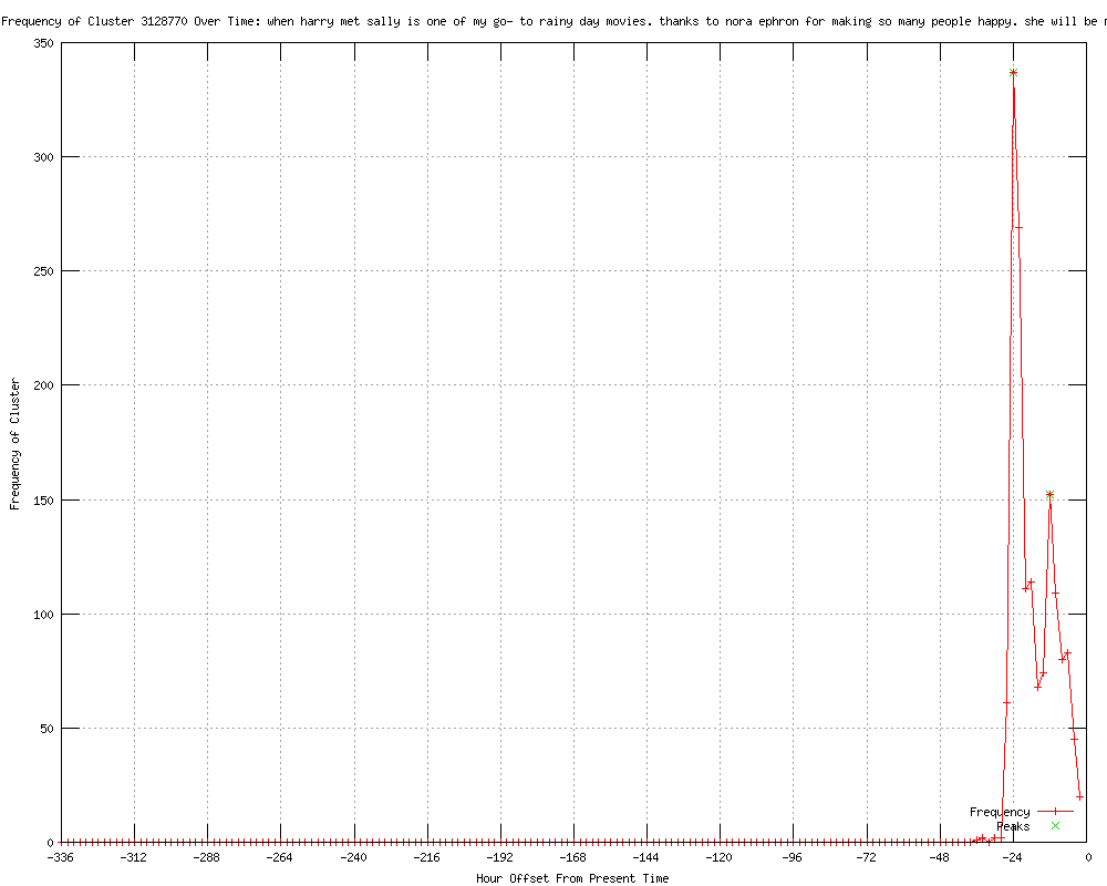 | 19 | when harry met sally is one of my go-to rainy day movies. thanks to nora ephron for making so many people happy. she will be missed Urls http://news-press.com/article/20120626/NATION/120626027/Oscar-nominated-filmmaker-Nora-Ephron-dead-age-71?odyssey=tab|topnews|img|Home http://kfvs.com/story/18888188/actors-writers-react-to-ephrons-death-on-twitter http://wlbt.com/story/18888188/actors-writers-react-to-ephrons-death-on-twitter http://newsvine.com/_news/2012/06/26/12425660-actors-writers-react-to-ephrons-death-on-twitter http://utsandiego.com/news/2012/jun/26/actors-writers-react-to-ephrons-death-on-twitter/ http://omg.yahoo.com/news/actors-writers-react-ephrons-death-twitter-013748854.html http://mail.com/news/us/1390188-actors-writers-react-to-ephrons-death-twitter.html http://hosted.ap.org/dynamic/stories/U/US_OBIT_NORA_EPHRON_TWITTER_REACTION?SITE=WCMHTV&SECTION=HOME&TEMPLATE=DEFAULT http://wonderwall.msn.com/entertainment/actors-writers-react-to-ephrons-death-on-twitter-1689980.story http://seattlepi.com/news/article/Actors-writers-react-to-Ephron-s-death-on-Twitter-3665001.php http://goerie.com/apps/pbcs.dll/article?AID=/20120626/APA/1206261046 http://bostonherald.com/entertainment/movies/general/view.bg?articleid=1061141735&srvc=rss http://sfgate.com/news/article/Actors-writers-react-to-Ephron-s-death-on-Twitter-3665001.php http://bostonherald.com/track/celebrity/view.bg?articleid=1061141735&srvc=rss http://seattletimes.nwsource.com/html/entertainment/2018536031_apusobitnoraephrontwitterreaction.html?syndication=rss http://cbsnews.com/8301-501368_162-57461216/actors-writers-react-to-ephrons-death-on-twitter/ http://entertainment.msn.com/news/article.aspx?news=739071&affid=100055 http://cbs3springfield.com/story/18888188/actors-writers-react-to-ephrons-death-on-twitter http://sify.com/movies/actors-writers-react-to-ephron-s-death-on-twitter-news-hollywood-mg1h4uihhih.html |