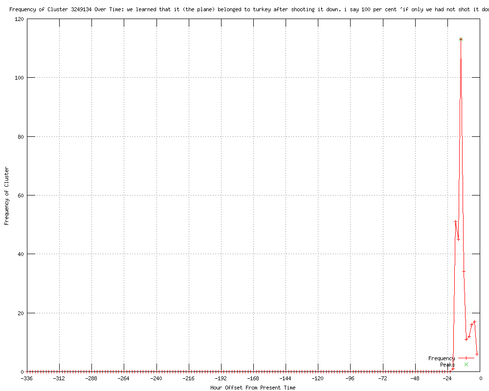 | 24 | we learned that it (the plane) belonged to turkey after shooting it down. i say 100 percent 'if only we had not shot it down' Urls http://independent.co.uk/news/world/middle-east/assad-expresses-regret-over-downed-turkish-jet-7905465.html http://today.az/news/regions/109712.html http://telegraph.feedsportal.com/c/32726/f/568301/s/20f36f85/l/0L0Stelegraph0O0Cnews0Cworldnews0Cmiddleeast0Csyria0C93717790CSyrias0EAssad0Eregrets0Eshooting0Edown0ETurkish0Ewarplane0Bhtml/story01.htm http://worldbulletin.net/index.php?aType=haber&ArticleID=92059 http://jpost.com/MiddleEast/Article.aspx?ID=276106&R=R1 http://cnews.canoe.ca/CNEWS/World/2012/07/03/19944151.html?cid=rssnewsworld http://telegraph.feedsportal.com/c/32726/f/579330/s/20f40379/l/0L0Stelegraph0O0Cnews0Cworldnews0Cmiddleeast0Csyria0C93717790CSyrias0EAssad0Eregrets0Eshooting0Edown0ETurkish0Ewarplane0Bhtml/story01.htm http://lfpress.com/news/world/2012/07/03/19944171.html http://cnews.canoe.ca/CNEWS/World/2012/07/03/19944151.html?cid=rssnews http://ottawasun.com/2012/07/03/assad-wishes-syrian-forces-hadnt-downed-turkish-jet http://winnipegsun.com/2012/07/03/assad-wishes-syrian-forces-hadnt-downed-turkish-jet http://telegraph.feedsportal.com/c/32726/f/564430/s/20f3d638/l/0L0Stelegraph0O0Cnews0Cworldnews0Cmiddleeast0Csyria0C93717790CSyrias0EAssad0Eregrets0Eshooting0Edown0ETurkish0Ewarplane0Bhtml/story01.htm http://rocketnews.com/2012/07/assad-regrets-downing-turkish-jet-paper-2/ http://rocketnews.com/2012/07/assad-regrets-downing-turkish-jet-paper/ http://hamaraphotos.com/news/general/assad-regrets-shooting-down-of-turkish-warplane.html http://wkzo.com/news/articles/2012/jul/03/assad-regrets-downing-turkish-jet-paper/ http://indiatalkies.com/2012/07/assad-regrets-shooting-turkish-warplane.html http://asharq-e.com/news.asp?section=1&id=30195 http://jpost.com/MiddleEast/Article.aspx?id=276106&R=R3 http://blackchristiannews.com/news/2012/07/syrias-assad-says-he-wished-the-downed-jet-from-turkey-had-been-israeli.html http://telegraph.feedsportal.com/c/32726/f/579330/s/20f5f0d8/l/0L0Stelegraph0O0Cnews0Cworldnews0Cmiddleeast0Csyria0C93717790CSyrias0EAssad0Eregrets0Eshooting0Edown0ETurkish0Ejet0Bhtml/story01.htm http://telegraph.feedsportal.com/c/32726/f/564430/s/20f5f83d/l/0L0Stelegraph0O0Cnews0Cworldnews0Cmiddleeast0Csyria0C93717790CSyrias0EAssad0Eregrets0Eshooting0Edown0ETurkish0Ejet0Bhtml/story01.htm http://newkerala.com/news/newsplus/worldnews-46750.html http://israelmatzav.blogspot.com/2012/07/assad-wishes-it-had-been-israeli-jet.html |