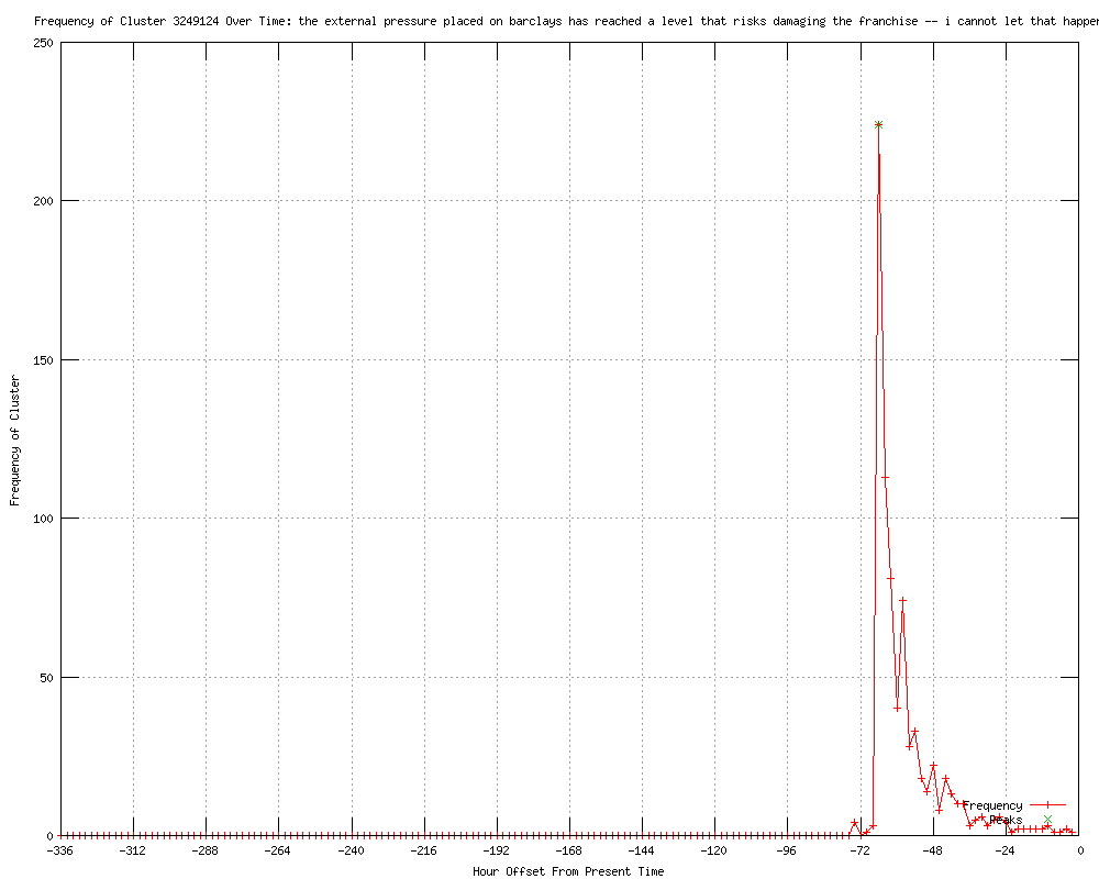 | 70 | the external pressure placed on barclays has reached a level that risks damaging the franchise -- i cannot let that happen Urls http://economictimes.feedsportal.com/fy/8av2EvS0bPZOn2gB/story01.htm http://au.news.yahoo.com/a/-/business/14121019/barclays-bank-chief-executive-diamond-resigns/ http://au.news.yahoo.com/a/-/world/14121019/barclays-bank-chief-executive-diamond-resigns/ http://economictimes.feedsportal.com/fy/8av2EvS0bPZkT2gB/story01.htm http://channelnewsasia.com/stories/afp_asiapacific_business/view/1211349/1/.html http://timesofindia.feedsportal.com/fy/8at2EuL0bPfQP2gB/story01.htm http://economictimes.feedsportal.com/fy/8av2Fvy0bPfB22gC/story01.htm http://wrd.mydigitalfc.com/news/barclays-chief-executive-bob-diamond-resign-342 http://au.news.yahoo.com/a/-/business/14121019/barclays-bank-chief-diamond-quits-over-rate-rigging/ http://au.news.yahoo.com/a/-/world/14121019/barclays-bank-chief-diamond-quits-over-rate-rigging/ http://tradingroom.com.au/apps/view_breaking_news_article.ac?page=/data/news_research/published/2012/7/185/catf_120703_192700_3012.html http://timesofindia.indiatimes.com/business/international-business/Barclays-chief-executive-Diamond-resigns-over-rate-rigging-scandal/articleshow/14636936.cms http://au.news.yahoo.com/a/-/world/14121019/barclays-city-reel-as-diamond-quits-over-rate-rigging/ http://au.news.yahoo.com/a/-/business/14121019/diamond-quits-in-barclays-boardroom-bloodbath/ http://au.news.yahoo.com/a/-/world/14121019/diamond-quits-in-barclays-boardroom-bloodbath/ http://au.news.yahoo.com/world/a/-/world/14121019/diamond-quits-in-barclays-boardroom-bloodbath/ http://feeds.boston.com/click.phdo?i=b1936152acfaaf9d48edf3be2e082f43 http://stockinvestips.com/2012/07/brief-world-markets-headlines-of-day.html http://mortgagenewsdaily.com/channels/pipelinepress/07032012-basel-iii-california-mortgage.aspx http://cleveland.com/business/index.ssf/2012/07/barclays_ceo_bob_diamond_quits.html http://azcentral.com/business/articles/2012/07/03/20120703barclays-ceo-diamond-quits-rate-fixing-scandal.html http://news.yahoo.com/barclays-bank-chief-executive-diamond-resigns-064227699.html http://news.yahoo.com/london-stocks-slightly-down-open-081339393.html http://business-news.thestreet.com/ocregister/story/stocks-to-watch-barclays-microsoft/11603838 http://fin24.com/Companies/Financial-Services/Barclays-British-bank-with-big-ambitions-20120703 http://latimes.com/business/la-fi-mo-barclays-departures-20120703,0,6610034.story?track=rss http://feeds.latimes.com/%7Er/latimes/business/%7E3/Acrf3cZx35I/la-fi-mo-barclays-departures-20120703,0,6610034.story http://latimes.com/business/money/la-fi-mo-barclays-departures-20120703,0,6974556.story?track=rss&utm_source=feedburner&utm_medium=feed&utm_campaign=Feed%3A+MoneyCompany+%28Money+%26+Company%29 http://smh.com.au/business/markets/diamond-quits-in-barclays-boardroom-bloodbath-20120704-21fyf.html http://brisbanetimes.com.au/business/markets/diamond-quits-in-barclays-boardroom-bloodbath-20120704-21fyf.html http://theage.com.au/business/markets/diamond-quits-in-barclays-boardroom-bloodbath-20120704-21fyf.html http://sg.news.yahoo.com/diamond-faces-grilling-barclays-exit-041408735.html http://uk.news.yahoo.com/diamond-faces-grilling-barclays-exit-031408753--finance.html http://afp.com/en/news/topstories/diamond-faces-grilling-after-barclays-exit http://au.news.yahoo.com/a/-/world/14132334/diamond-faces-grilling-after-barclays-exit/ http://au.news.yahoo.com/world/a/-/world/14132334/diamond-faces-grilling-after-barclays-exit/ http://economictimes.feedsportal.com/fy/8av2Fvy0bSAND2gY/story01.htm http://brecorder.com/top-news/1-front-top-news/65568-diamond-faces-grilling-in-parliament-after-barclays-exit.html http://economictimes.feedsportal.com/fy/8av2EvS0bS9BN2gY/story01.htm http://uk.news.yahoo.com/diamond-faces-grilling-barclays-exit-032250226.html http://english.alarabiya.net/articles/2012/07/04/224406.html http://news.yahoo.com/diamond-faces-grilling-barclays-exit-041408019.html http://emirates247.com/news/world/barclays-ex-ceo-faces-grilling-in-uk-parliament-2012-07-04-1.465849 http://au.news.yahoo.com/a/-/business/14132334/diamond-faces-parliament-grilling-after-barclays-exit/ http://au.news.yahoo.com/a/-/world/14132334/diamond-faces-parliament-grilling-after-barclays-exit/ http://au.news.yahoo.com/world/a/-/world/14132334/diamond-faces-parliament-grilling-after-barclays-exit/ http://freep.com/article/20120704/BUSINESS07/207040329/1002/business http://article.wn.com/view/2012/07/04/Barclays_scandal_Key_players/ http://article.wn.com/view/2012/07/04/ExCEO_of_Barclays_to_face_parliamentary_grilling_over_false__h/ http://article.wn.com/view/2012/07/04/Barclays_exboss_Diamond_slams_reprehensible_action/ http://deccanchronicle.com/channels/business/news/diamond-faces-grilling-parliament-after-barclays-exit-722 http://article.wn.com/view/2012/07/04/Bob_Diamond_calls_behaviour_at_Barclays_reprehensible/ http://brecorder.com/top-news/1-front-top-news/65674-diamond-faces-grilling-in-parliament-after-barclays-exit-.html http://article.wn.com/view/2012/07/04/UK_MPs_question_former_Barclays_executive/ http://article.wn.com/view/2012/07/04/Barclays_exCEO_avoids_implicating_UK_authorities_2/ http://article.wn.com/view/2012/07/04/ExBarlcays_CEO_claims_rivals_also_rigged_Libor_0/ http://article.wn.com/view/2012/07/04/Barclays_exboss_Bob_Diamond_is_sorry_and_angry/ http://article.wn.com/view/2012/07/04/ExBarclays_CEO_claims_rivals_also_rigged_Libor_5/ http://article.wn.com/view/2012/07/04/Barclays_Diamond_admits_mistakes/ http://article.wn.com/view/2012/07/04/Financial_deceit_It_isnt_just_oh_so_British/ http://article.wn.com/view/2012/07/04/Barclays_MPs_query_Bob_Diamond_evidence/ http://article.wn.com/view/2012/07/05/There_were_14_bad_people_at_Barclays_but_I_wasnt_one_of_them/ http://article.wn.com/view/2012/07/05/Bob_Diamond_banks_across_the_world_were_fixing_interest_rate/ http://article.wn.com/view/2012/07/05/Bob_Diamond_hints_he_is_