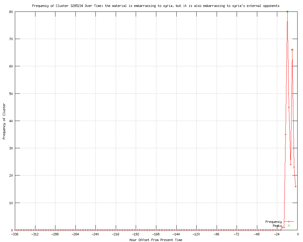 | 17 | embarrassing to syria, but it is also embarrassing to syria's opponents Urls http://rt.com/news/wikileaks-syria-files-revealed-478/ http://mybroadband.co.za/vb/showthread.php/445619-WikiLeaks-releases-Syria-Files-almost-2-5-mln-emails-to-be-published?goto=newpost http://digitaljournal.com/article/327979 http://deathandtaxesmag.com/185528/wikileaks-releases-syria-files-containing-2-5-million-emails/ http://abcnews.go.com/blogs/headlines/2012/07/the-global-note-afghan-firefight-u-k-terror-scares-fukushimas-man-made-disaster-europes-tallest-building/ http://investmentwatchblog.com/coming-soon-wikileaks-releases-syria-files-almost-2-5-mln-emails-to-be-published-the-data-is-more-than-8-times-the-size-of-cablegate-documents-said-to-be-embarrassing-to-syria/ http://lunaticoutpost.com/Topic-WikiLeaks-releases-Syria-Files-almost-2-5-mln-emails-to-be-published http://news.matia.gr/2012-07/syriagate-wikileaks-releases-syria-files-2-5-mln-emails-to-be-published/ http://saltspringnews.com/index.php?name=News&file=article&sid=22597 http://independent.co.uk/news/world/middle-east/wikileaks-is-back--without-assange-but-with-a-cache-of-syrian-emails-7917611.html http://chimpplanet.blogspot.com/2012/07/syriagate-wikileaks-releases-syria.html http://article.wn.com/view/2012/07/05/WikiLeaks_is_back_without_Assange_but_with_a_cache_of_Syrian/ http://keerzijde.blogspot.com/2012/07/syriagate-wikileaks-releases-syria.html http://butlincat.blogspot.com/2012/07/wikileaks-to-release-25-million-syrian.html http://eurasiareview.com/05072012-wikileaks-releases-syria-files-contains-almost-2-5-million-emails/ http://rubaiatahmed.blogspot.com/2012/07/wikileaks-releases-syria-files-almost.html http://bydio.com/2012/07/05/wikileaks-releases-syria-files-almost-2-5-mln-emails-to-be-published/ |