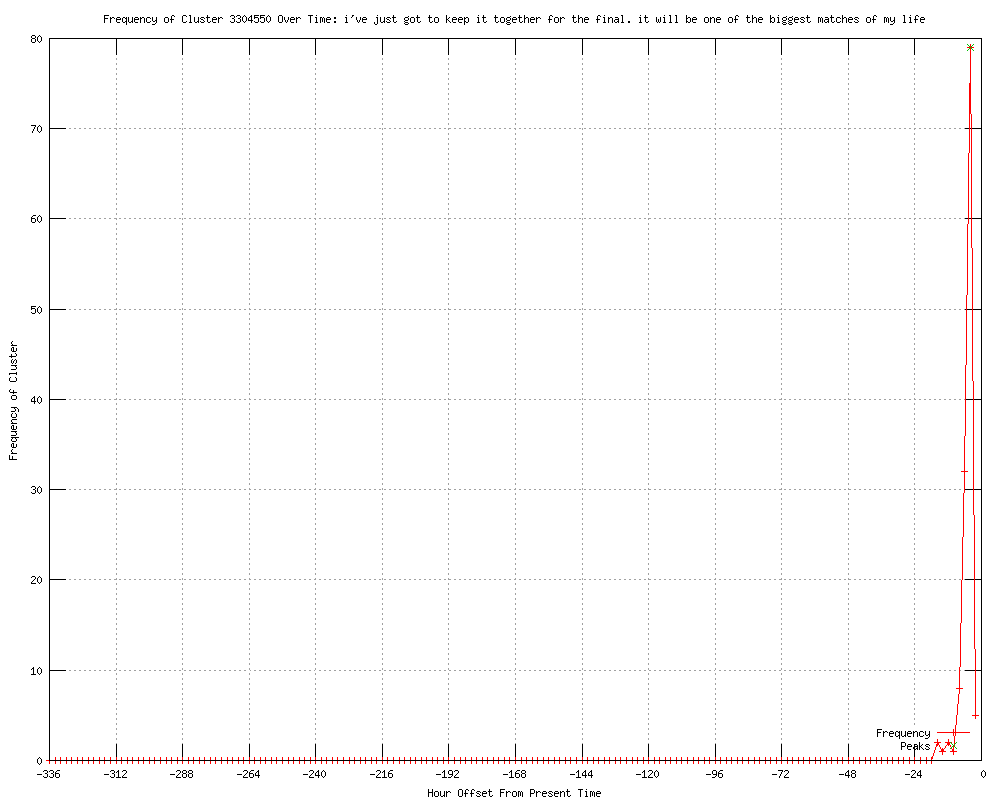 | 12 | i've just got to keep it together for the final. it will be one of the biggest matches of my life Urls http://uk.news.yahoo.com/murray-fuels-mania-tsonga-win-federer-awaits-203537606--ten.html http://uk.reuters.com/article/2012/07/06/tennis-wimbledon-idUKL6E8I6BS020120706?feedType=RSS&feedName=tennisNews http://uk.reuters.com/article/2012/07/06/uk-tennis-wimbledon-idUKBRE86510M20120706?feedType=RSS&feedName=sportsNews http://in.reuters.com/article/2012/07/06/tennis-wimbledon-murray-federer-idINDEE8650DL20120706?feedType=RSS&feedName=topNews http://moneycontrol.com/news/wire-news/murray-fuels-maniatsonga-win-federer-awaits_727175.html http://kgmi.com/Murray-fuels-mania-with-Tsonga-win-Federer-awaits/11461894?newsId=152618 http://uk.reuters.com/article/2012/07/06/uk-tennis-wimbledon-idUKBRE86510M20120706?feedType=RSS&feedName=topNews http://theglobeandmail.com/sports/more-sports/murray-fuels-mania-with-trip-to-wimbledon-final-where-federer-awaits/article4394860/?cmpid=rss1 http://archive.japantoday.com/category/sports/view/murray-fuels-mania-with-tsonga-win-federer-awaits http://feeds.reuters.com/%7Er/Reuters/UKTopNews/%7E3/XpdeiDzni7w/uk-tennis-wimbledon-idUKBRE86510M20120706 http://allnews.rss.themalaysianinsider.com/c/33362/f/567634/s/21183b44/l/0L0Sthemalaysianinsider0N0Csports0Carticle0Cmurray0Efuels0Emania0Ewith0Etsonga0Ewin0Efederer0Eawaits0C/story01.htm http://bdnews24.com/details.php?id=227765&cid=5 |