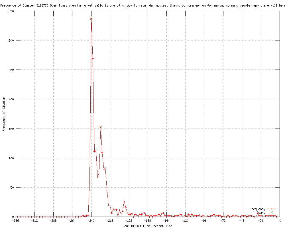 | 19 | when harry met sally is one of my go-to rainy day movies. thanks to nora ephron for making so many people happy. she will be missed Urls http://news-press.com/article/20120626/NATION/120626027/Oscar-nominated-filmmaker-Nora-Ephron-dead-age-71?odyssey=tab|topnews|img|Home http://kfvs.com/story/18888188/actors-writers-react-to-ephrons-death-on-twitter http://wlbt.com/story/18888188/actors-writers-react-to-ephrons-death-on-twitter http://newsvine.com/_news/2012/06/26/12425660-actors-writers-react-to-ephrons-death-on-twitter http://utsandiego.com/news/2012/jun/26/actors-writers-react-to-ephrons-death-on-twitter/ http://omg.yahoo.com/news/actors-writers-react-ephrons-death-twitter-013748854.html http://mail.com/news/us/1390188-actors-writers-react-to-ephrons-death-twitter.html http://hosted.ap.org/dynamic/stories/U/US_OBIT_NORA_EPHRON_TWITTER_REACTION?SITE=WCMHTV&SECTION=HOME&TEMPLATE=DEFAULT http://wonderwall.msn.com/entertainment/actors-writers-react-to-ephrons-death-on-twitter-1689980.story http://seattlepi.com/news/article/Actors-writers-react-to-Ephron-s-death-on-Twitter-3665001.php http://goerie.com/apps/pbcs.dll/article?AID=/20120626/APA/1206261046 http://bostonherald.com/entertainment/movies/general/view.bg?articleid=1061141735&srvc=rss http://sfgate.com/news/article/Actors-writers-react-to-Ephron-s-death-on-Twitter-3665001.php http://bostonherald.com/track/celebrity/view.bg?articleid=1061141735&srvc=rss http://seattletimes.nwsource.com/html/entertainment/2018536031_apusobitnoraephrontwitterreaction.html?syndication=rss http://cbsnews.com/8301-501368_162-57461216/actors-writers-react-to-ephrons-death-on-twitter/ http://entertainment.msn.com/news/article.aspx?news=739071&affid=100055 http://cbs3springfield.com/story/18888188/actors-writers-react-to-ephrons-death-on-twitter http://sify.com/movies/actors-writers-react-to-ephron-s-death-on-twitter-news-hollywood-mg1h4uihhih.html |
