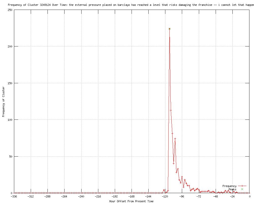 | 75 | the external pressure placed on barclays has reached a level that risks damaging the franchise -- i cannot let that happen Urls http://economictimes.feedsportal.com/fy/8av2EvS0bPZOn2gB/story01.htm http://au.news.yahoo.com/a/-/business/14121019/barclays-bank-chief-executive-diamond-resigns/ http://au.news.yahoo.com/a/-/world/14121019/barclays-bank-chief-executive-diamond-resigns/ http://economictimes.feedsportal.com/fy/8av2EvS0bPZkT2gB/story01.htm http://channelnewsasia.com/stories/afp_asiapacific_business/view/1211349/1/.html http://timesofindia.feedsportal.com/fy/8at2EuL0bPfQP2gB/story01.htm http://economictimes.feedsportal.com/fy/8av2Fvy0bPfB22gC/story01.htm http://wrd.mydigitalfc.com/news/barclays-chief-executive-bob-diamond-resign-342 http://au.news.yahoo.com/a/-/business/14121019/barclays-bank-chief-diamond-quits-over-rate-rigging/ http://au.news.yahoo.com/a/-/world/14121019/barclays-bank-chief-diamond-quits-over-rate-rigging/ http://tradingroom.com.au/apps/view_breaking_news_article.ac?page=/data/news_research/published/2012/7/185/catf_120703_192700_3012.html http://timesofindia.indiatimes.com/business/international-business/Barclays-chief-executive-Diamond-resigns-over-rate-rigging-scandal/articleshow/14636936.cms http://au.news.yahoo.com/a/-/world/14121019/barclays-city-reel-as-diamond-quits-over-rate-rigging/ http://au.news.yahoo.com/a/-/business/14121019/diamond-quits-in-barclays-boardroom-bloodbath/ http://au.news.yahoo.com/a/-/world/14121019/diamond-quits-in-barclays-boardroom-bloodbath/ http://au.news.yahoo.com/world/a/-/world/14121019/diamond-quits-in-barclays-boardroom-bloodbath/ http://feeds.boston.com/click.phdo?i=b1936152acfaaf9d48edf3be2e082f43 http://stockinvestips.com/2012/07/brief-world-markets-headlines-of-day.html http://mortgagenewsdaily.com/channels/pipelinepress/07032012-basel-iii-california-mortgage.aspx http://cleveland.com/business/index.ssf/2012/07/barclays_ceo_bob_diamond_quits.html http://azcentral.com/business/articles/2012/07/03/20120703barclays-ceo-diamond-quits-rate-fixing-scandal.html http://news.yahoo.com/barclays-bank-chief-executive-diamond-resigns-064227699.html http://news.yahoo.com/london-stocks-slightly-down-open-081339393.html http://business-news.thestreet.com/ocregister/story/stocks-to-watch-barclays-microsoft/11603838 http://fin24.com/Companies/Financial-Services/Barclays-British-bank-with-big-ambitions-20120703 http://latimes.com/business/la-fi-mo-barclays-departures-20120703,0,6610034.story?track=rss http://feeds.latimes.com/%7Er/latimes/business/%7E3/Acrf3cZx35I/la-fi-mo-barclays-departures-20120703,0,6610034.story http://latimes.com/business/money/la-fi-mo-barclays-departures-20120703,0,6974556.story?track=rss&utm_source=feedburner&utm_medium=feed&utm_campaign=Feed%3A+MoneyCompany+%28Money+%26+Company%29 http://smh.com.au/business/markets/diamond-quits-in-barclays-boardroom-bloodbath-20120704-21fyf.html http://brisbanetimes.com.au/business/markets/diamond-quits-in-barclays-boardroom-bloodbath-20120704-21fyf.html http://theage.com.au/business/markets/diamond-quits-in-barclays-boardroom-bloodbath-20120704-21fyf.html http://sg.news.yahoo.com/diamond-faces-grilling-barclays-exit-041408735.html http://uk.news.yahoo.com/diamond-faces-grilling-barclays-exit-031408753--finance.html http://afp.com/en/news/topstories/diamond-faces-grilling-after-barclays-exit http://au.news.yahoo.com/a/-/world/14132334/diamond-faces-grilling-after-barclays-exit/ http://au.news.yahoo.com/world/a/-/world/14132334/diamond-faces-grilling-after-barclays-exit/ http://economictimes.feedsportal.com/fy/8av2Fvy0bSAND2gY/story01.htm http://brecorder.com/top-news/1-front-top-news/65568-diamond-faces-grilling-in-parliament-after-barclays-exit.html http://economictimes.feedsportal.com/fy/8av2EvS0bS9BN2gY/story01.htm http://uk.news.yahoo.com/diamond-faces-grilling-barclays-exit-032250226.html http://english.alarabiya.net/articles/2012/07/04/224406.html http://news.yahoo.com/diamond-faces-grilling-barclays-exit-041408019.html http://emirates247.com/news/world/barclays-ex-ceo-faces-grilling-in-uk-parliament-2012-07-04-1.465849 http://au.news.yahoo.com/a/-/business/14132334/diamond-faces-parliament-grilling-after-barclays-exit/ http://au.news.yahoo.com/a/-/world/14132334/diamond-faces-parliament-grilling-after-barclays-exit/ http://au.news.yahoo.com/world/a/-/world/14132334/diamond-faces-parliament-grilling-after-barclays-exit/ http://freep.com/article/20120704/BUSINESS07/207040329/1002/business http://article.wn.com/view/2012/07/04/Barclays_scandal_Key_players/ http://article.wn.com/view/2012/07/04/ExCEO_of_Barclays_to_face_parliamentary_grilling_over_false__h/ http://article.wn.com/view/2012/07/04/Barclays_exboss_Diamond_slams_reprehensible_action/ http://deccanchronicle.com/channels/business/news/diamond-faces-grilling-parliament-after-barclays-exit-722 http://article.wn.com/view/2012/07/04/Bob_Diamond_calls_behaviour_at_Barclays_reprehensible/ http://brecorder.com/top-news/1-front-top-news/65674-diamond-faces-grilling-in-parliament-after-barclays-exit-.html http://article.wn.com/view/2012/07/04/UK_MPs_question_former_Barclays_executive/ http://article.wn.com/view/2012/07/04/Barclays_exCEO_avoids_implicating_UK_authorities_2/ http://article.wn.com/view/2012/07/04/ExBarlcays_CEO_claims_rivals_also_rigged_Libor_0/ http://article.wn.com/view/2012/07/04/Barclays_exboss_Bob_Diamond_is_sorry_and_angry/ http://article.wn.com/view/2012/07/04/ExBarclays_CEO_claims_rivals_also_rigged_Libor_5/ http://article.wn.com/view/2012/07/04/Barclays_Diamond_admits_mistakes/ http://article.wn.com/view/2012/07/04/Financial_deceit_It_isnt_just_oh_so_British/ http://article.wn.com/view/2012/07/04/Barclays_MPs_query_Bob_Diamond_evidence/ http://article.wn.com/view/2012/07/05/There_were_14_bad_people_at_Barclays_but_I_wasnt_one_of_them/ http://article.wn.com/view/2012/07/05/Bob_Diamond_banks_across_the_world_were_fixing_interest_rate/ http://article.wn.com/view/2012/07/05/Bob_Diamond_hints_he_is_