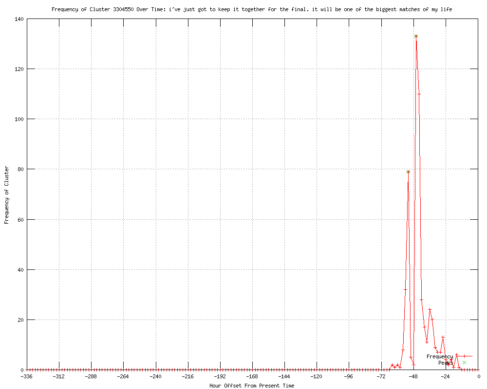 | 12 | i've just got to keep it together for the final. it will be one of the biggest matches of my life Urls http://uk.news.yahoo.com/murray-fuels-mania-tsonga-win-federer-awaits-203537606--ten.html http://uk.reuters.com/article/2012/07/06/tennis-wimbledon-idUKL6E8I6BS020120706?feedType=RSS&feedName=tennisNews http://uk.reuters.com/article/2012/07/06/uk-tennis-wimbledon-idUKBRE86510M20120706?feedType=RSS&feedName=sportsNews http://in.reuters.com/article/2012/07/06/tennis-wimbledon-murray-federer-idINDEE8650DL20120706?feedType=RSS&feedName=topNews http://moneycontrol.com/news/wire-news/murray-fuels-maniatsonga-win-federer-awaits_727175.html http://kgmi.com/Murray-fuels-mania-with-Tsonga-win-Federer-awaits/11461894?newsId=152618 http://uk.reuters.com/article/2012/07/06/uk-tennis-wimbledon-idUKBRE86510M20120706?feedType=RSS&feedName=topNews http://theglobeandmail.com/sports/more-sports/murray-fuels-mania-with-trip-to-wimbledon-final-where-federer-awaits/article4394860/?cmpid=rss1 http://archive.japantoday.com/category/sports/view/murray-fuels-mania-with-tsonga-win-federer-awaits http://feeds.reuters.com/%7Er/Reuters/UKTopNews/%7E3/XpdeiDzni7w/uk-tennis-wimbledon-idUKBRE86510M20120706 http://allnews.rss.themalaysianinsider.com/c/33362/f/567634/s/21183b44/l/0L0Sthemalaysianinsider0N0Csports0Carticle0Cmurray0Efuels0Emania0Ewith0Etsonga0Ewin0Efederer0Eawaits0C/story01.htm http://bdnews24.com/details.php?id=227765&cid=5 |