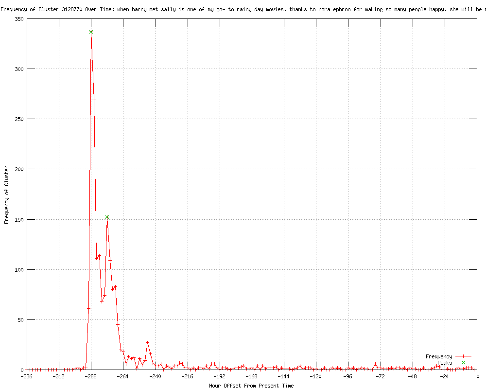 | 19 | when harry met sally is one of my go-to rainy day movies. thanks to nora ephron for making so many people happy. she will be missed Urls http://news-press.com/article/20120626/NATION/120626027/Oscar-nominated-filmmaker-Nora-Ephron-dead-age-71?odyssey=tab|topnews|img|Home http://kfvs.com/story/18888188/actors-writers-react-to-ephrons-death-on-twitter http://wlbt.com/story/18888188/actors-writers-react-to-ephrons-death-on-twitter http://newsvine.com/_news/2012/06/26/12425660-actors-writers-react-to-ephrons-death-on-twitter http://utsandiego.com/news/2012/jun/26/actors-writers-react-to-ephrons-death-on-twitter/ http://omg.yahoo.com/news/actors-writers-react-ephrons-death-twitter-013748854.html http://mail.com/news/us/1390188-actors-writers-react-to-ephrons-death-twitter.html http://hosted.ap.org/dynamic/stories/U/US_OBIT_NORA_EPHRON_TWITTER_REACTION?SITE=WCMHTV&SECTION=HOME&TEMPLATE=DEFAULT http://wonderwall.msn.com/entertainment/actors-writers-react-to-ephrons-death-on-twitter-1689980.story http://seattlepi.com/news/article/Actors-writers-react-to-Ephron-s-death-on-Twitter-3665001.php http://goerie.com/apps/pbcs.dll/article?AID=/20120626/APA/1206261046 http://bostonherald.com/entertainment/movies/general/view.bg?articleid=1061141735&srvc=rss http://sfgate.com/news/article/Actors-writers-react-to-Ephron-s-death-on-Twitter-3665001.php http://bostonherald.com/track/celebrity/view.bg?articleid=1061141735&srvc=rss http://seattletimes.nwsource.com/html/entertainment/2018536031_apusobitnoraephrontwitterreaction.html?syndication=rss http://cbsnews.com/8301-501368_162-57461216/actors-writers-react-to-ephrons-death-on-twitter/ http://entertainment.msn.com/news/article.aspx?news=739071&affid=100055 http://cbs3springfield.com/story/18888188/actors-writers-react-to-ephrons-death-on-twitter http://sify.com/movies/actors-writers-react-to-ephron-s-death-on-twitter-news-hollywood-mg1h4uihhih.html |