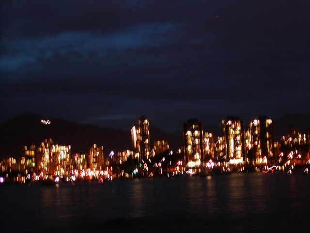 Botched-up, tripod-less shot of the night skyline over English Bay. But a lovely sky and neat reflections on the water.